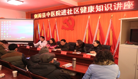 为践行党的群众路线教育,密切服务百姓,2016年1月25日下午,剑阁县中医院由医务人员组成的党员志愿服务队在党委书记王国道、副书记赵鸿的带领下,走进普安卧龙社区开展健康知识讲座,发放健康知识读本近200份,讲座现场进行疾病咨询、医疗答疑,共有40余位老年人前来学习健康知识。