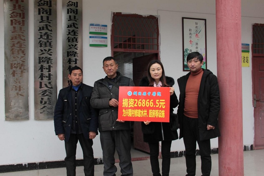 2017年1月16日,剑阁县中医院党委副书记赵鸿一行来到武连镇兴隆村,代表中医院为村委会捐款26866.5元,用于该村委会修建水井、厨房等设施。赵书记现现场查看了相关设施完成的情况,详细询问了水井的水质情况等。在村委会的会议室,赵书记叮嘱村干部和驻村第一书记,春节将至,我们代表医院来慰问大家,医院干部职工为兴隆村踊跃捐款,以实际行动弘扬中华民族“扶贫济困”的传统美德和友善,为贫困群众献上一份爱心,捧出一片爱心,点燃一盏希望。为脱贫攻坚增添一份力量。所捐资金要全部用于扶贫项目建设。