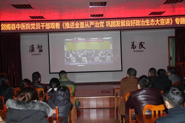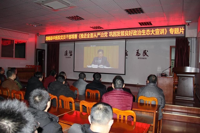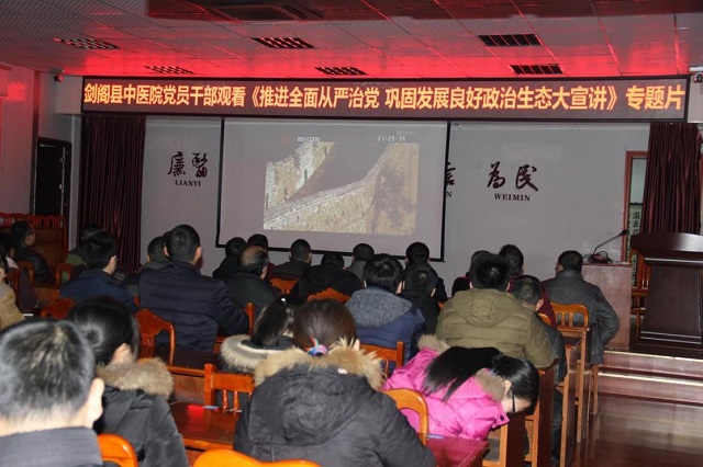 2017年1月20日21时30分,剑阁县中医院组织在岗党员干部在六楼学术会议室观看了四川卫视首播的《推进全面从严治党 巩固发展良好政治生态大宣讲》专题片(以下简称“专题片”)。参加此次活动的党员干部共计有100余人。